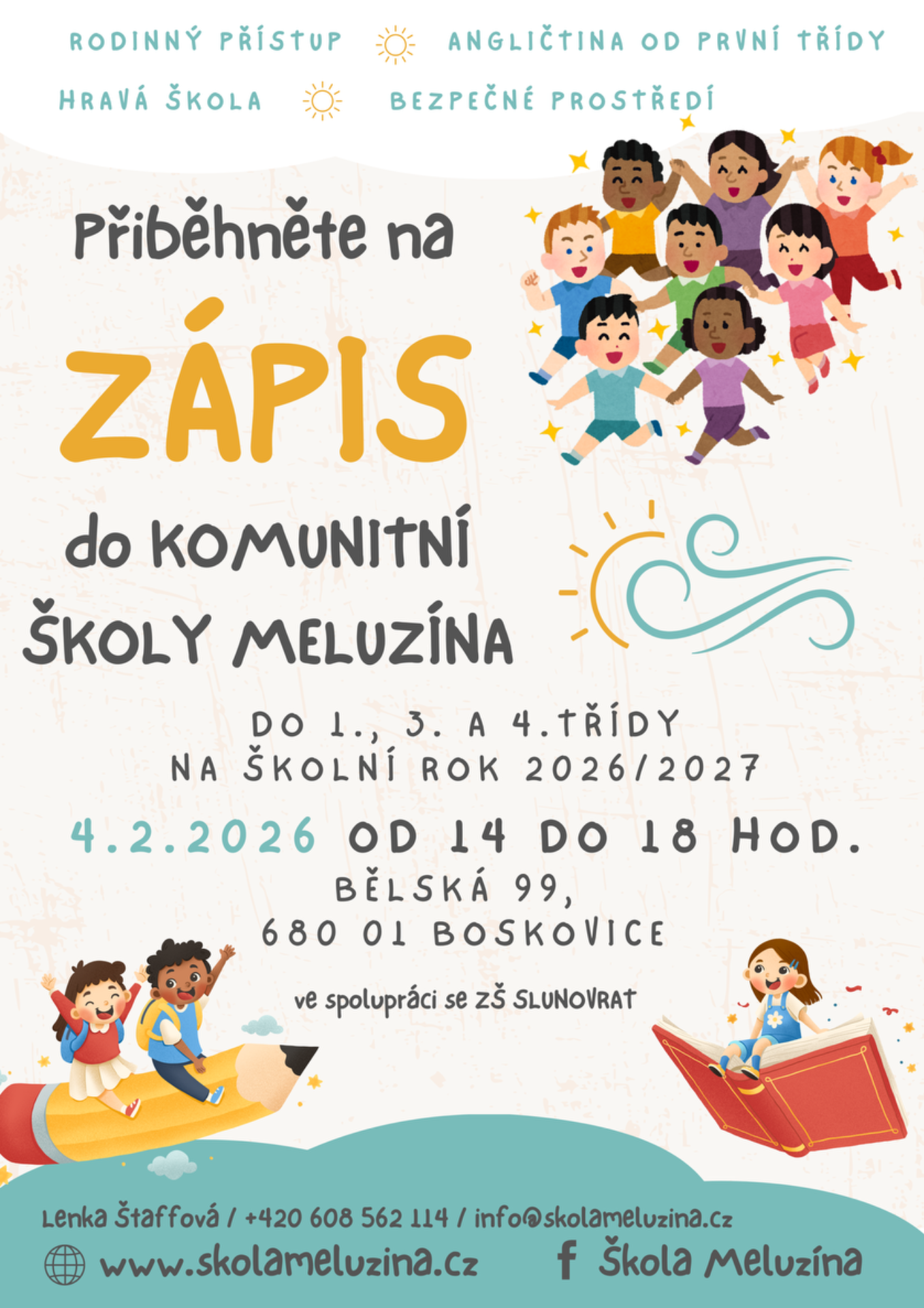 Přiběhněte na zápis do komunitní školy Meluzína dne 4. 4. 2025 od 14 do 18 hodin. Otevíráme místa pro první až třetí třídu. Nezapomeňte vyplnit a donést k zápisu také dotazník, který nám pomůže lépe pochopit vaše hodnoty a očekávání od školy. Pro lepší organizaci zápisu se prosím na zápis přihlaste.